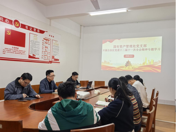 为深入学习贯彻自治区党委十二届十一次全会精神,引导党员干部自觉把思想和行动统一到上级决策部署上来,2026年3月4日,国有资产管理处党支部组织开展自治区党委十二届十一次全会精神专题学习会。